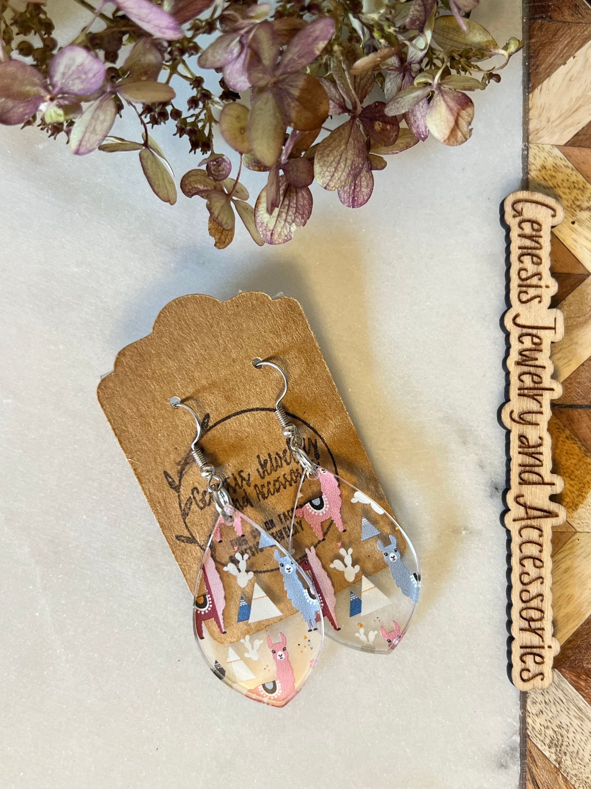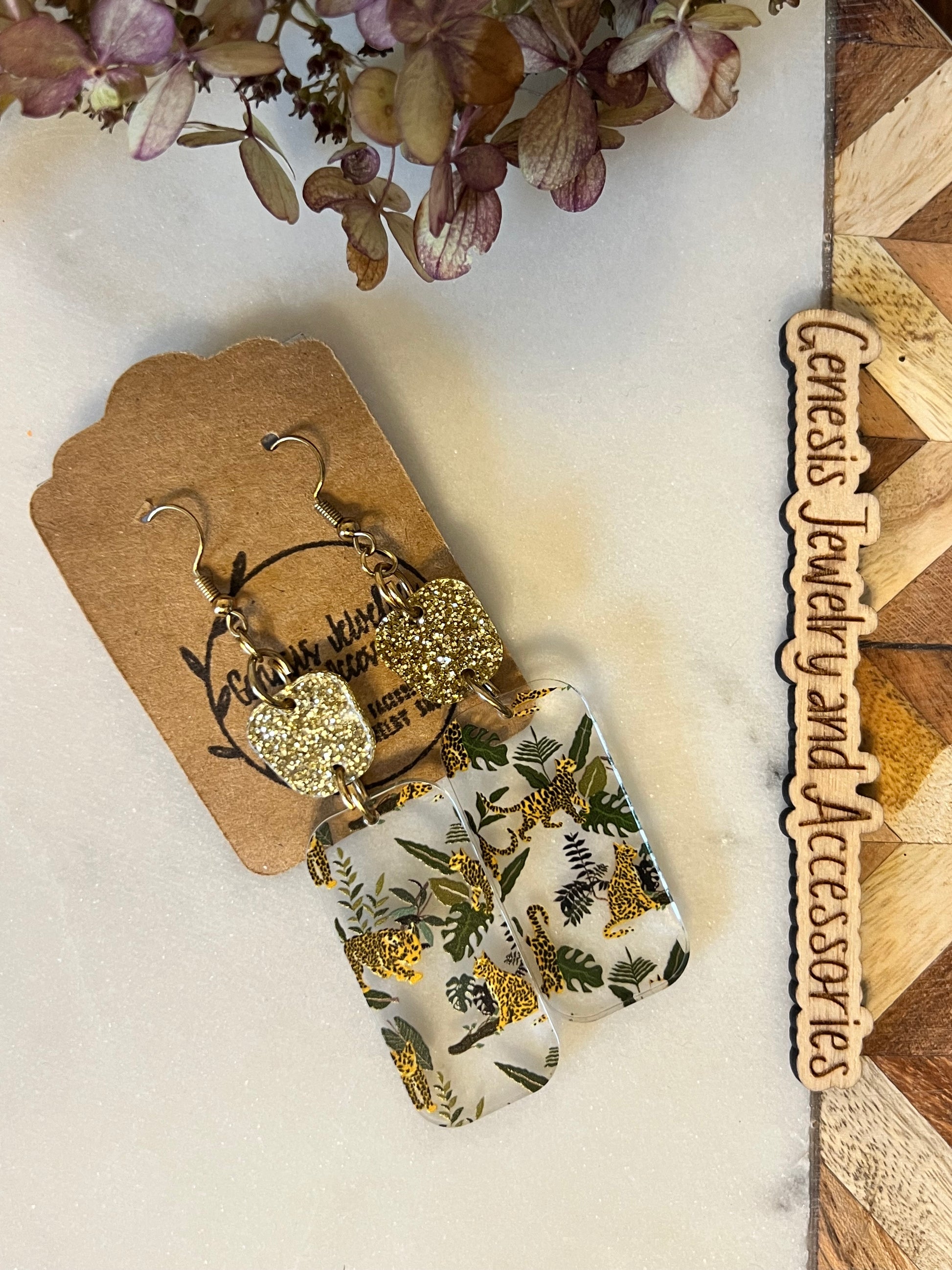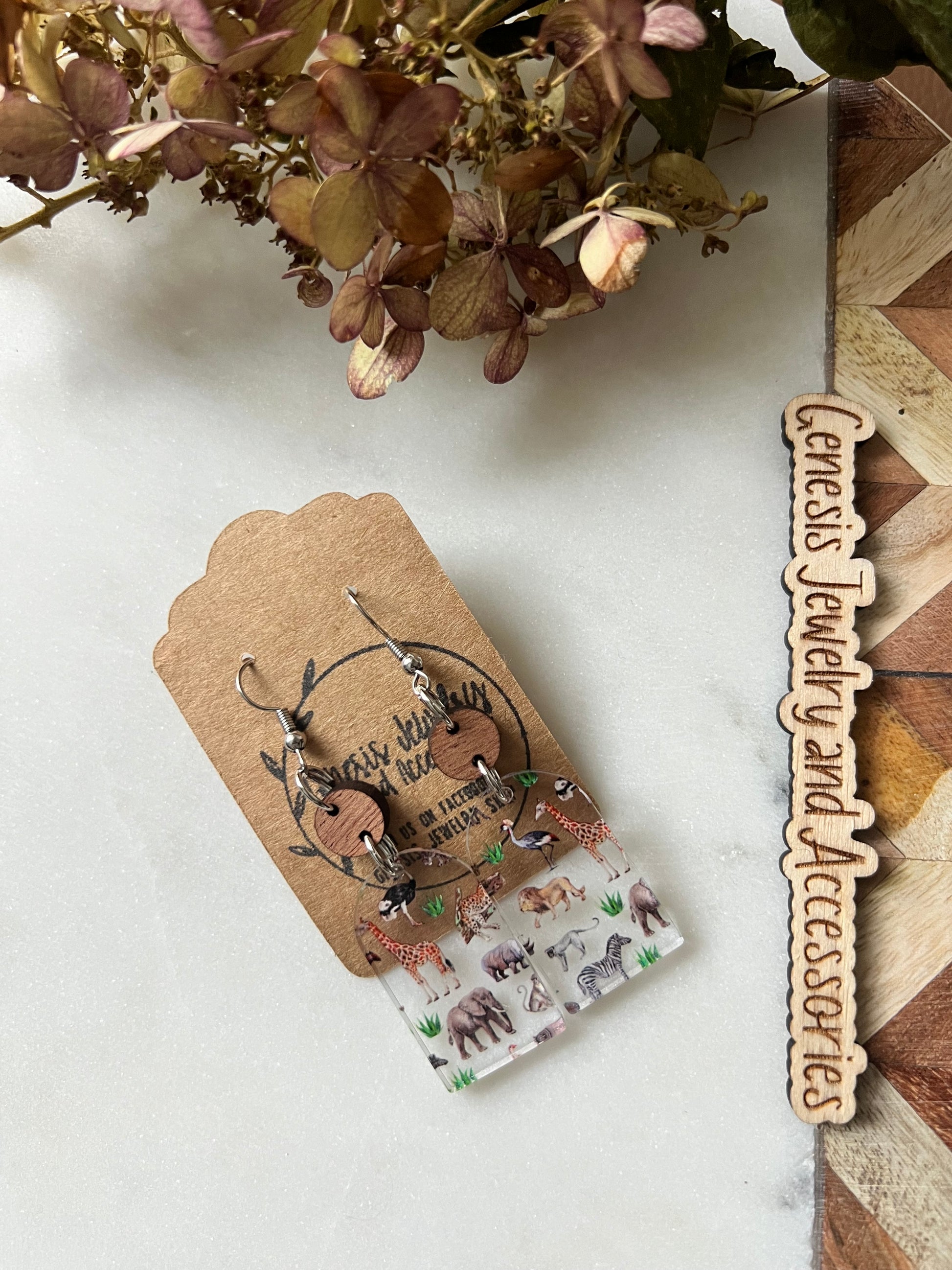 Custom acrylic animal and animal print dangle earrings including leopard, zebra, ladybugs, dinosaurs, llamas, snakes, and butterflies
