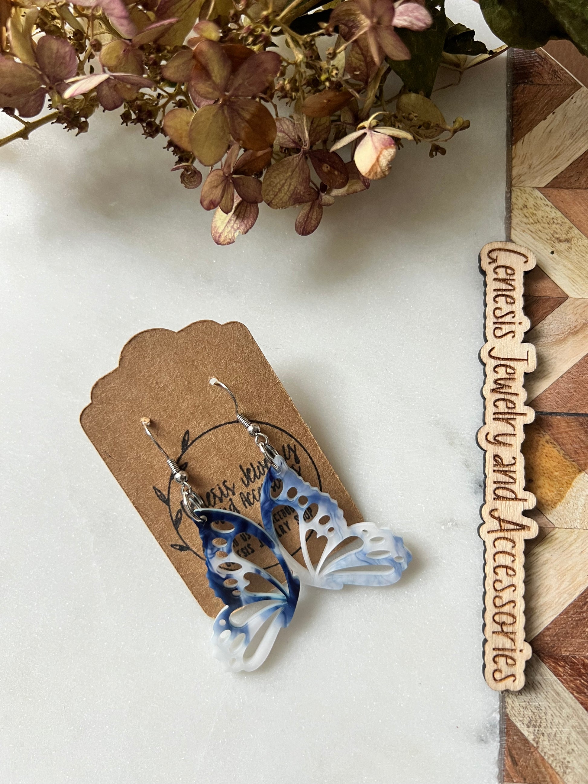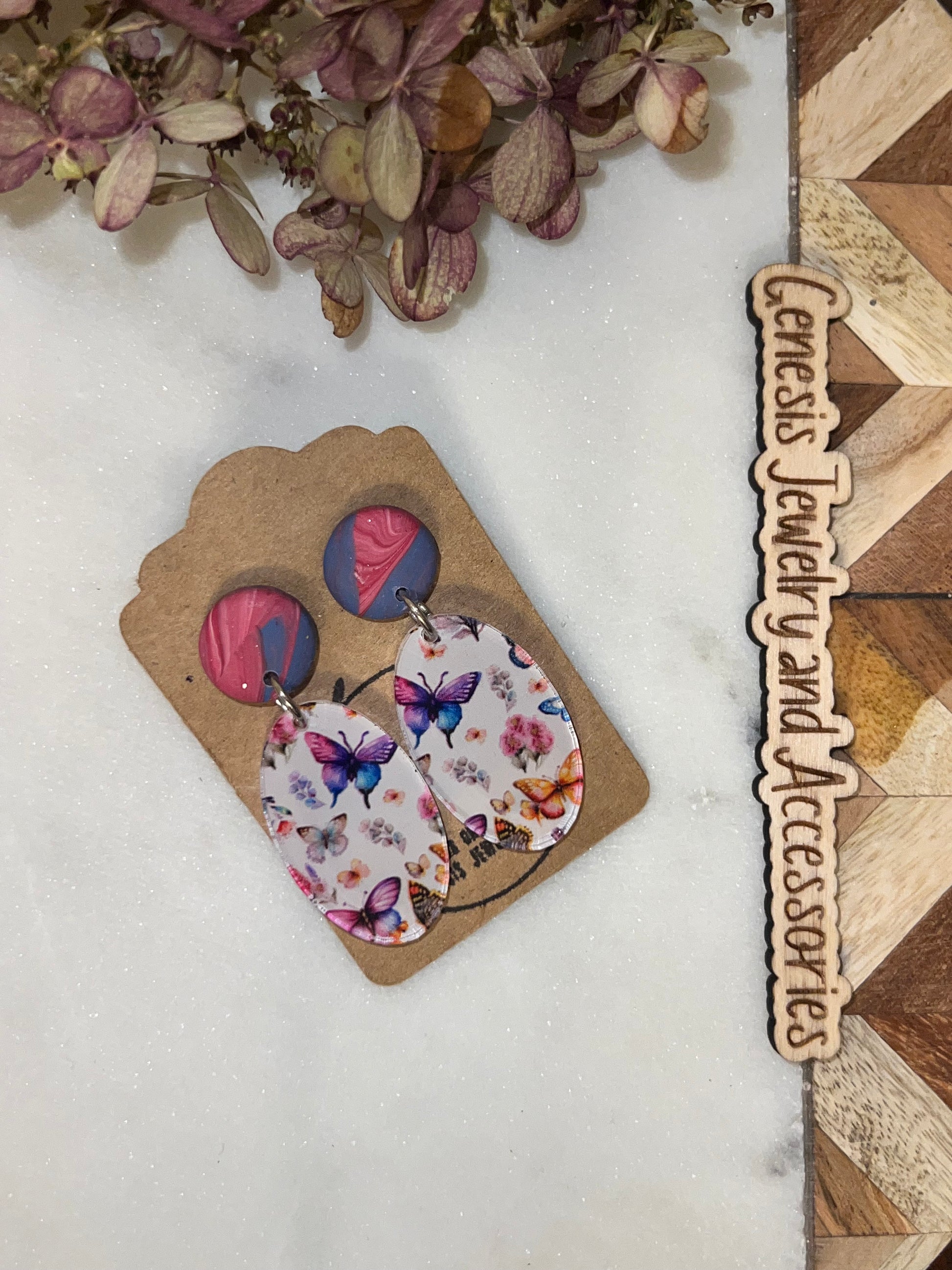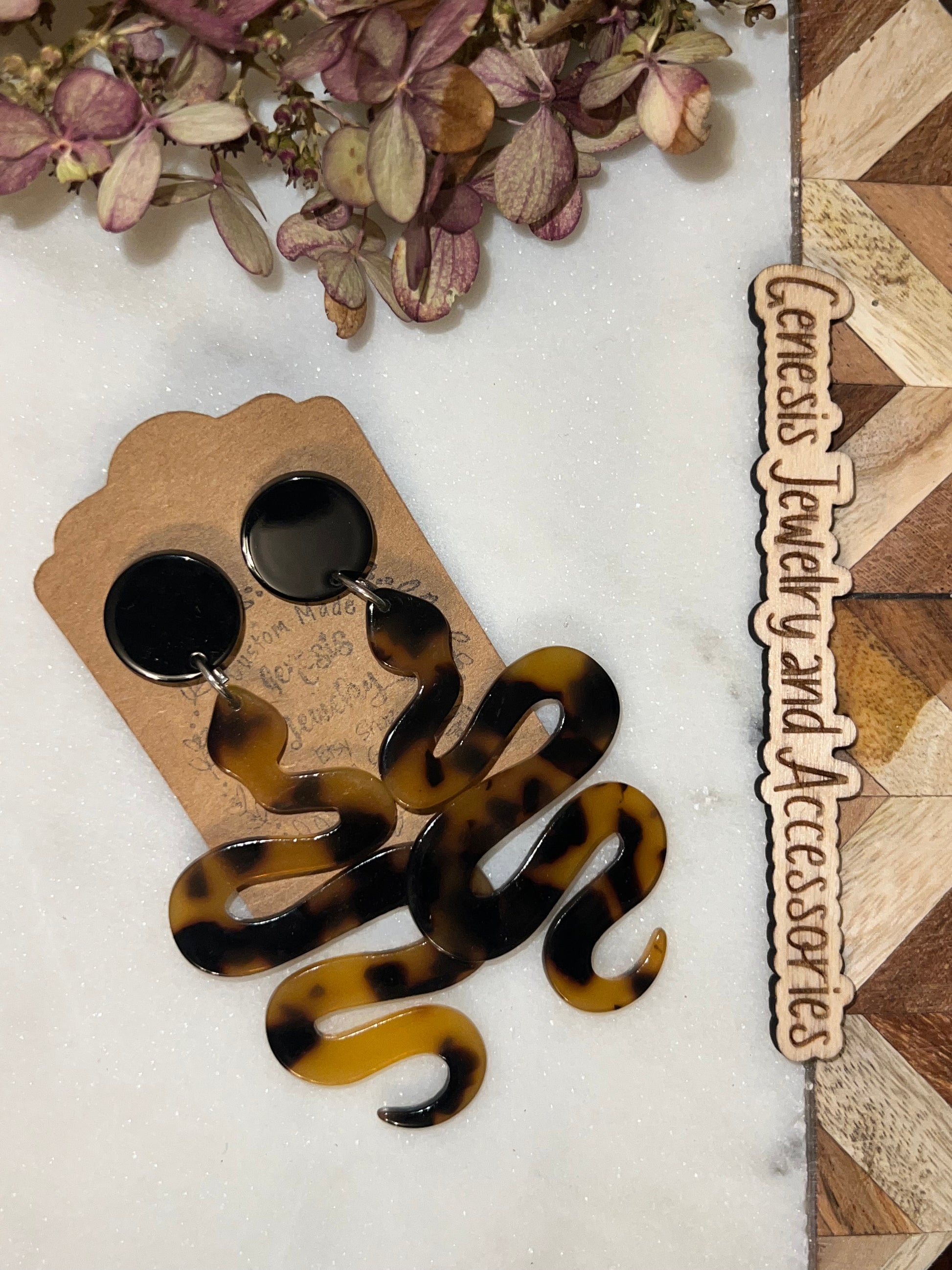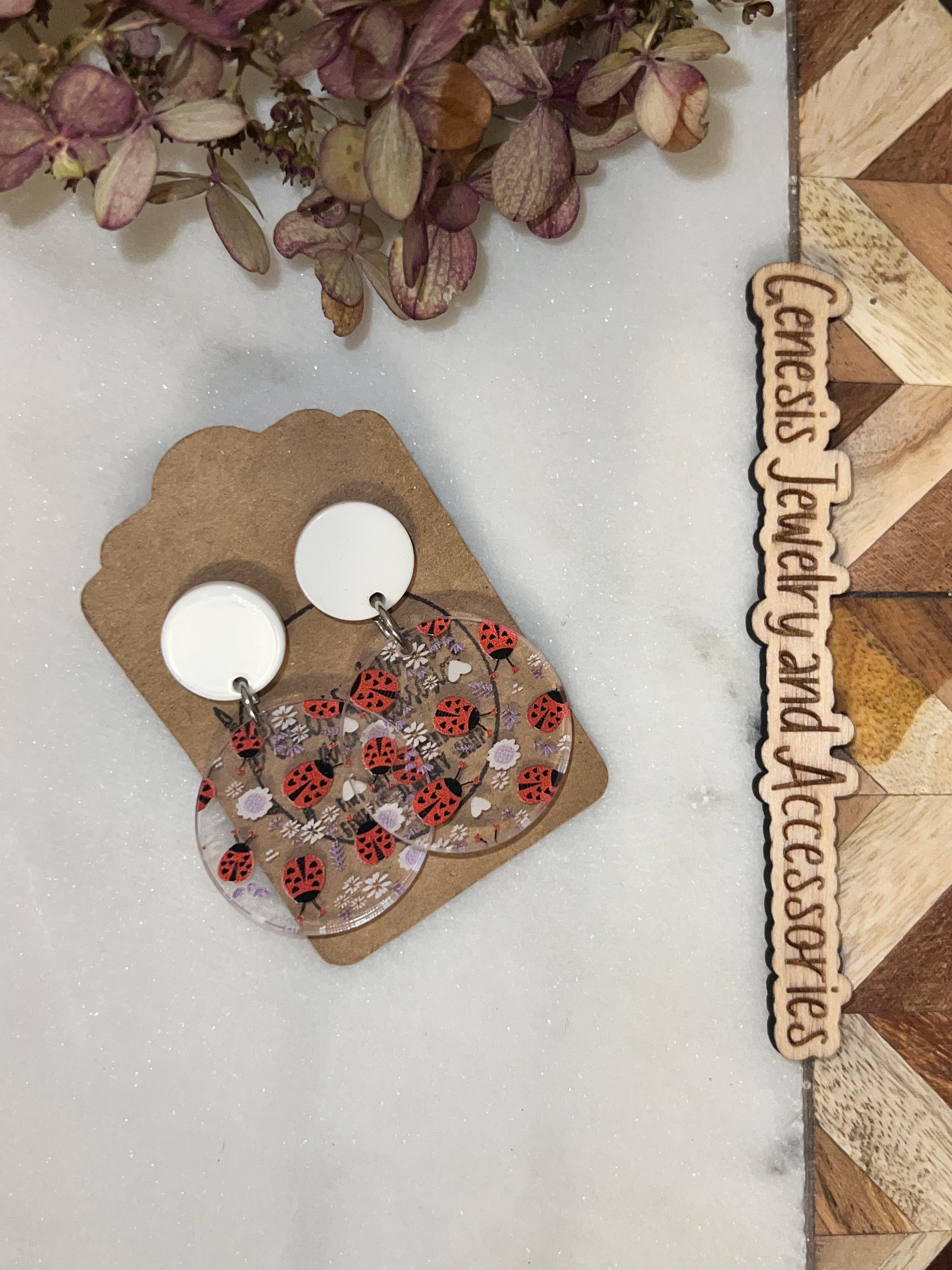 Custom acrylic animal and animal print dangle earrings including leopard, zebra, ladybugs, dinosaurs, llamas, snakes, and butterflies