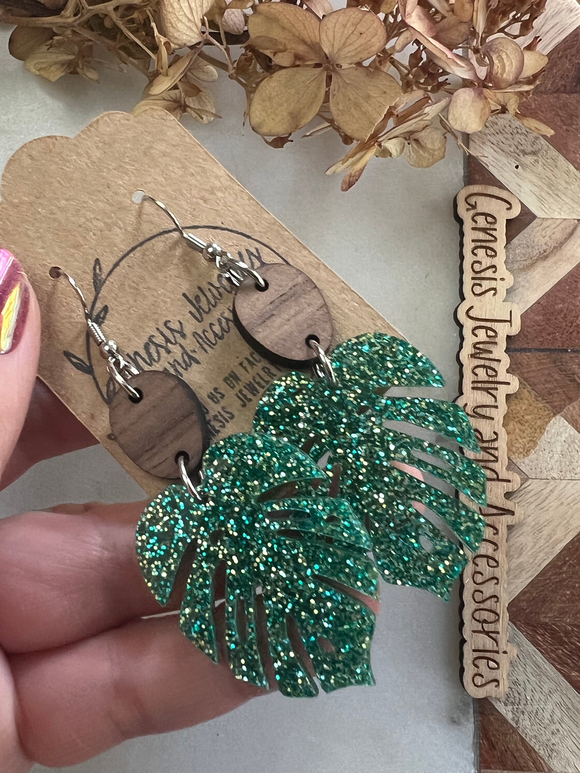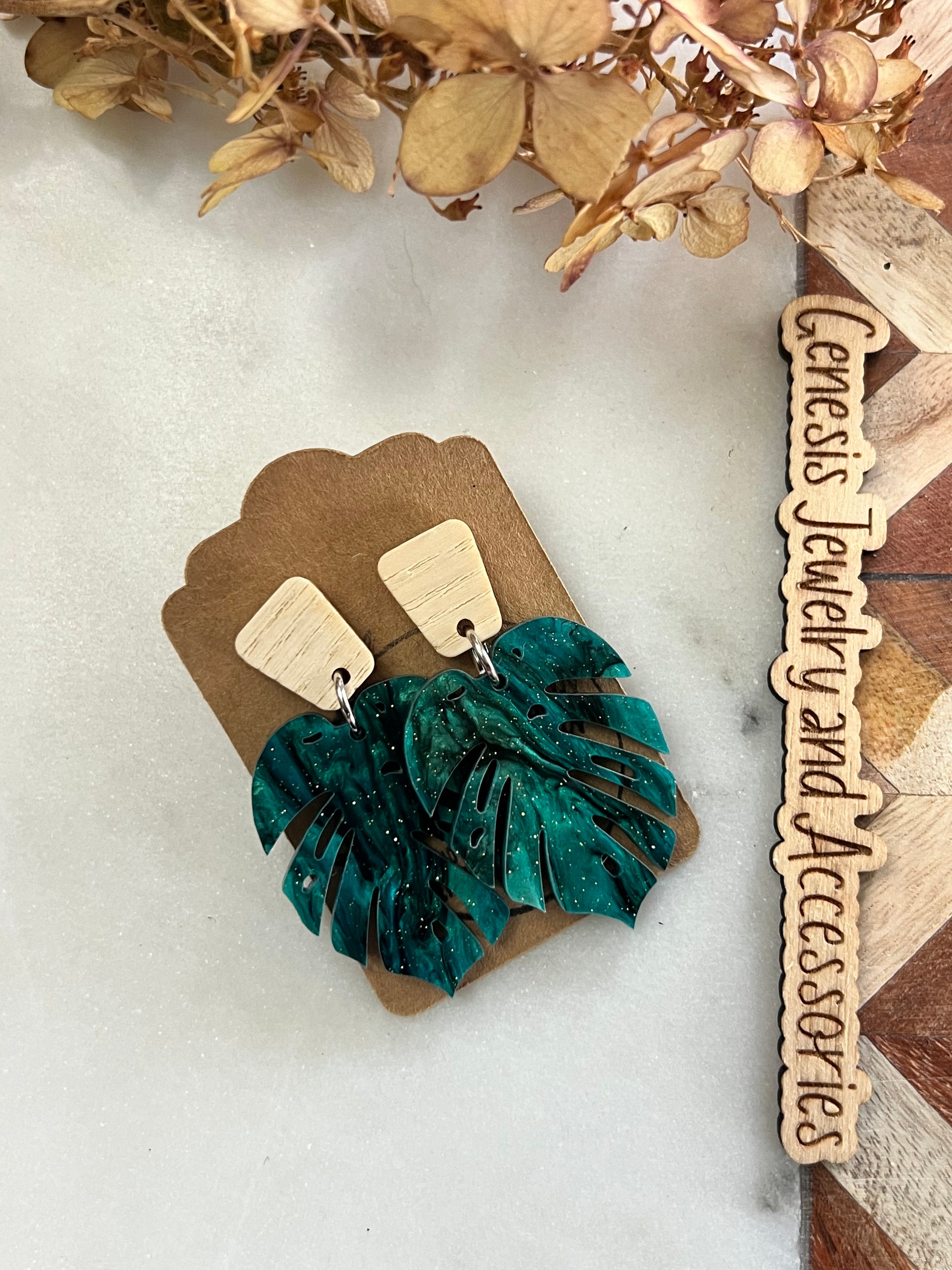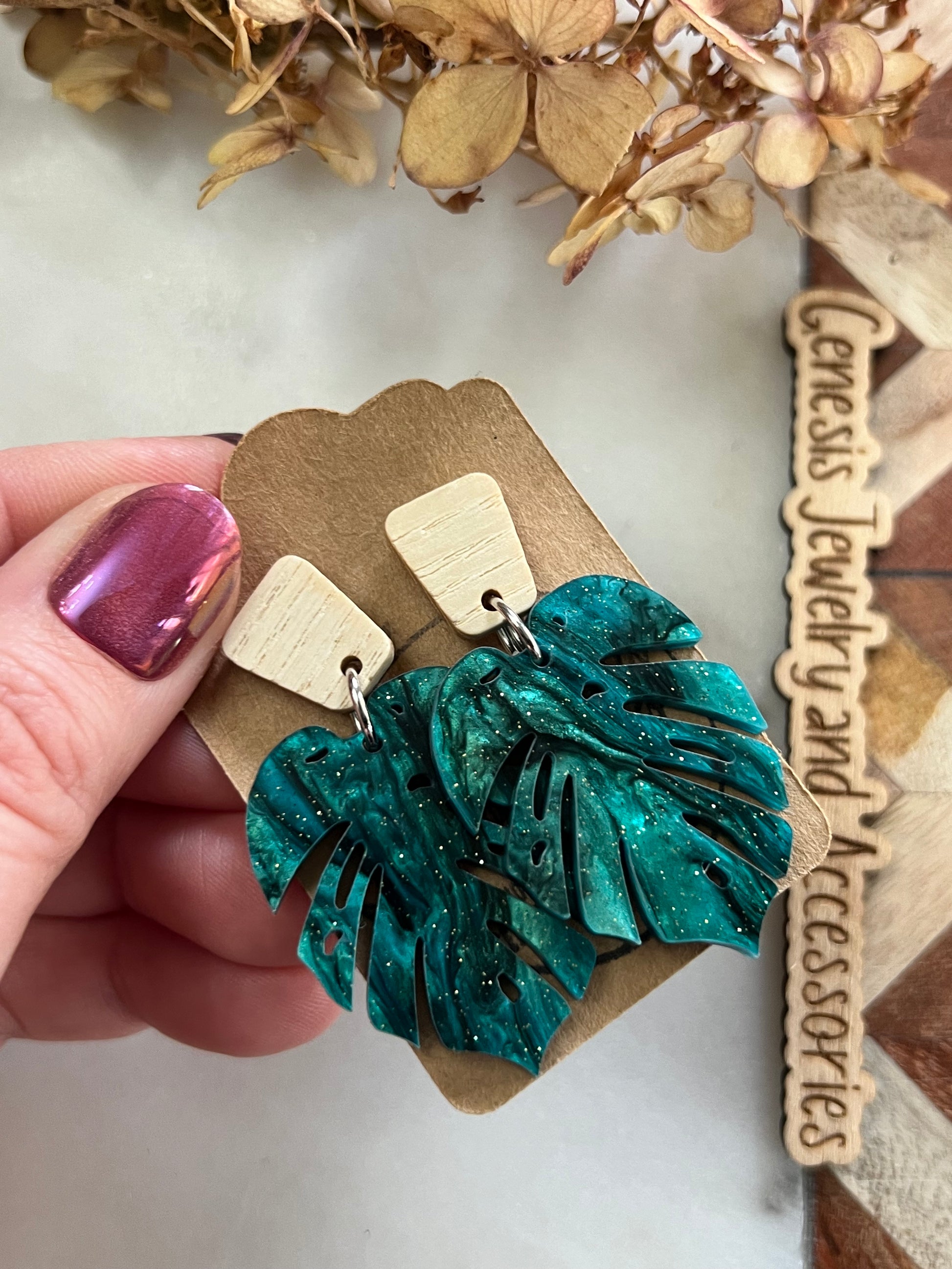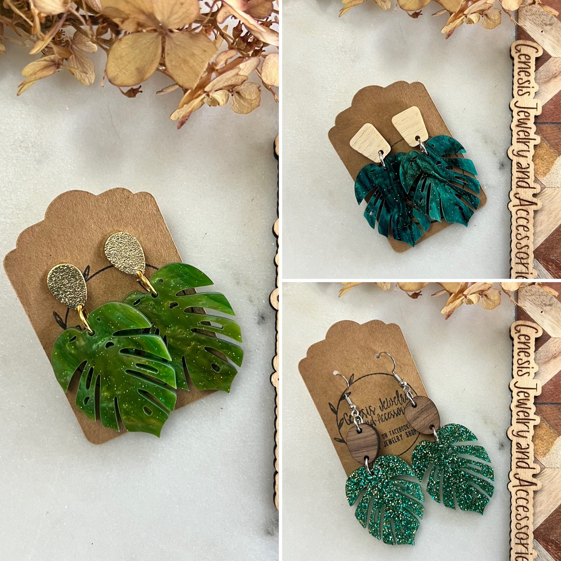 Custom acrylic dangle earrings (three different colors!) with wood and metal accents.