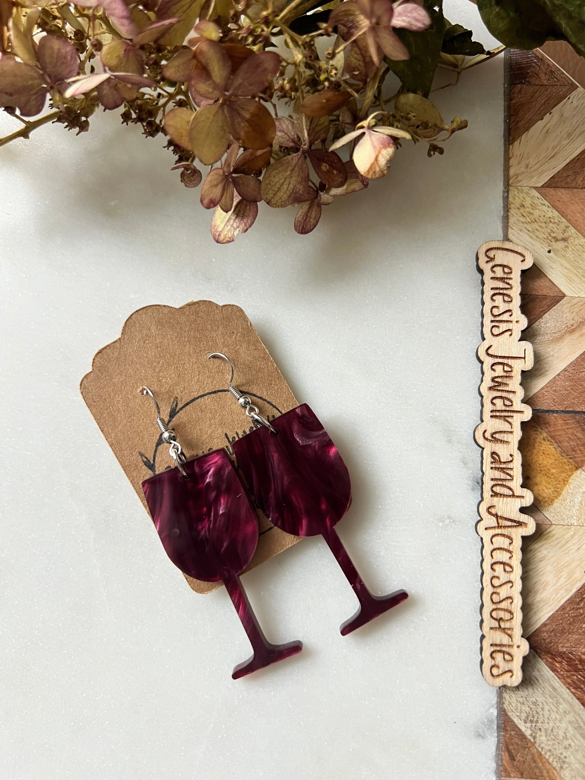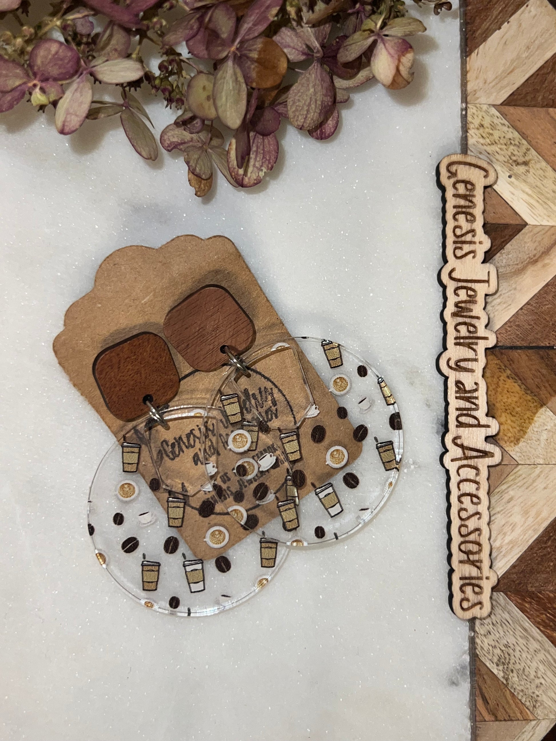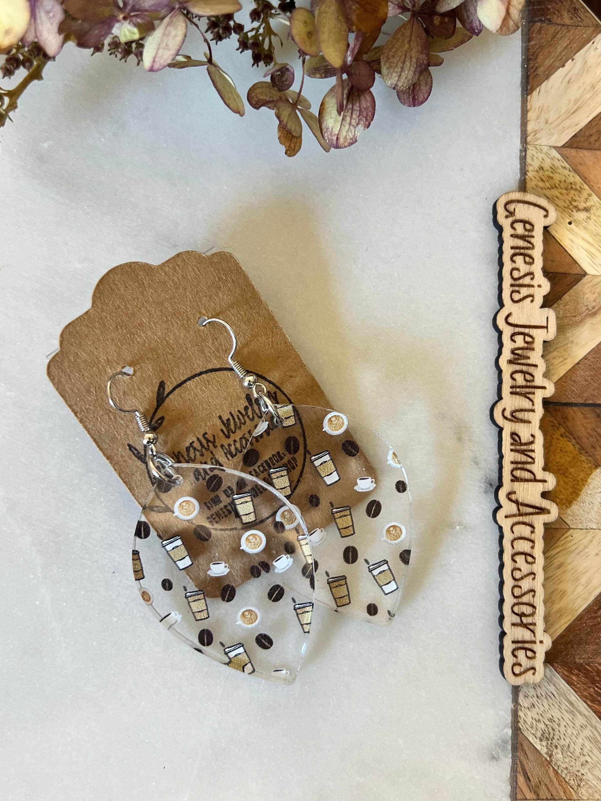Custom acrylic beverage dangle earrings including coffee, tea and wine.