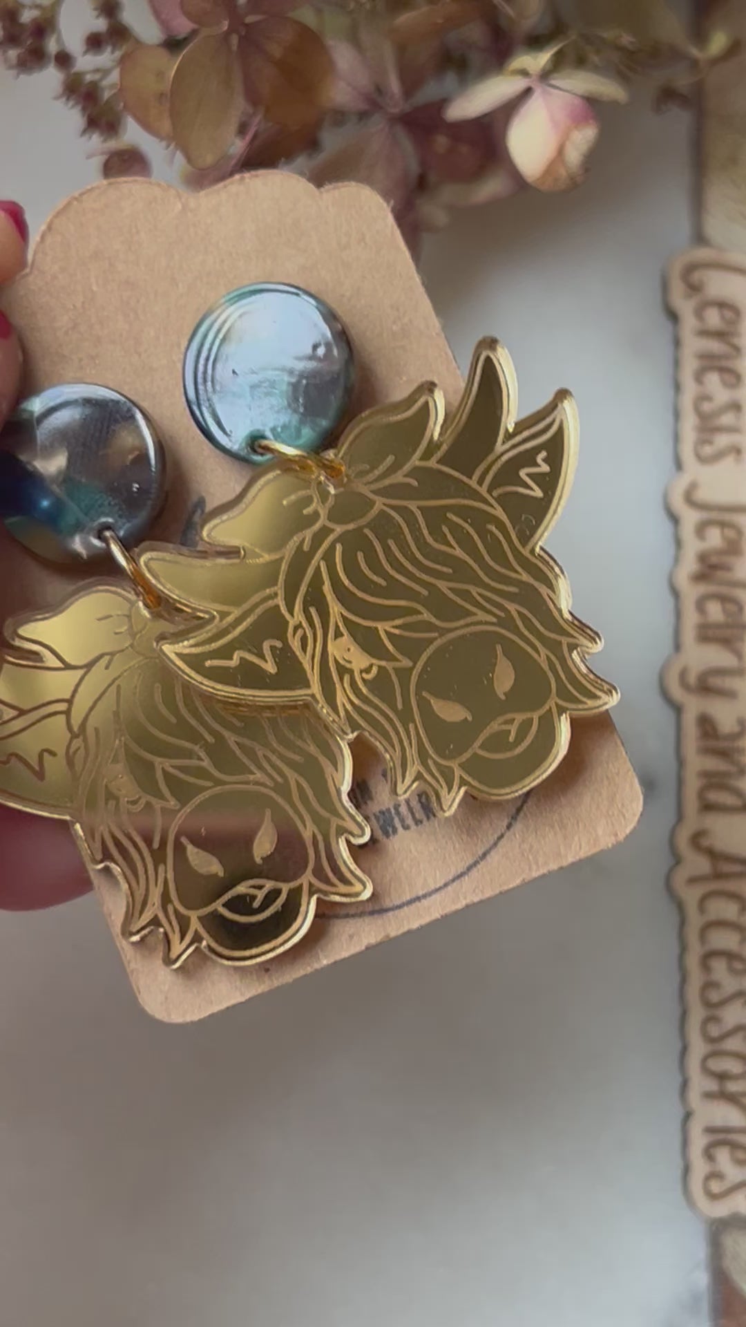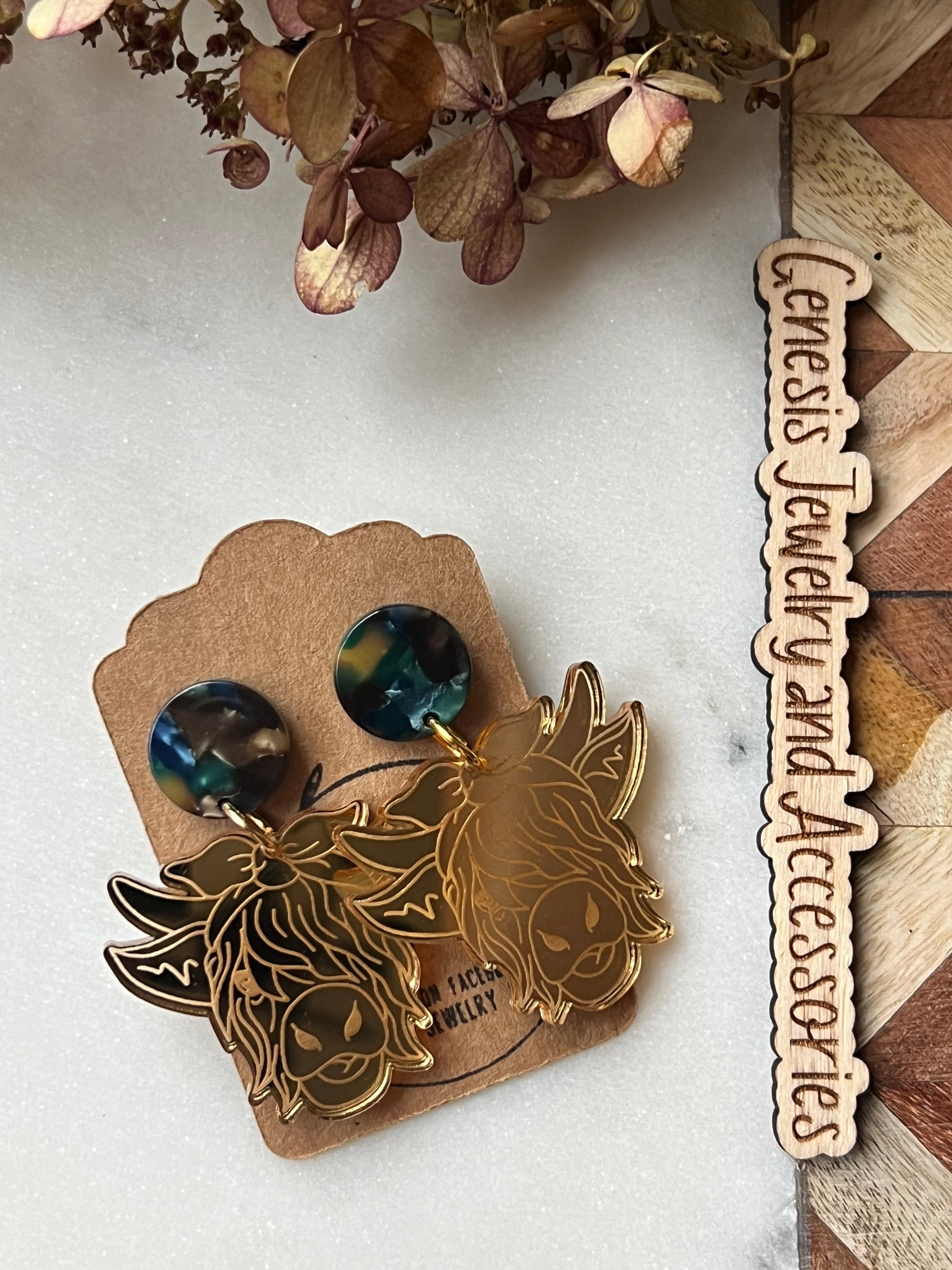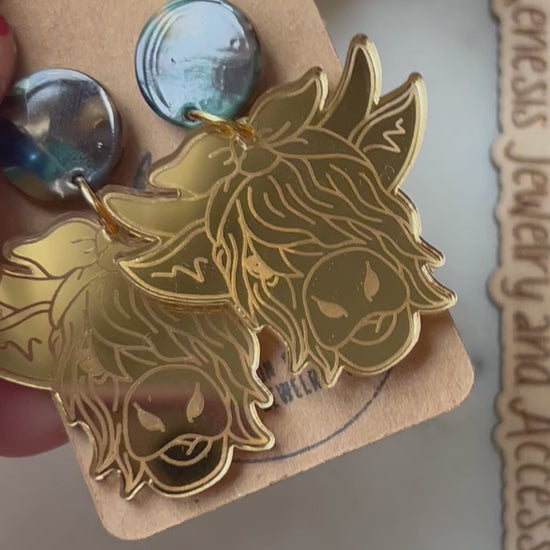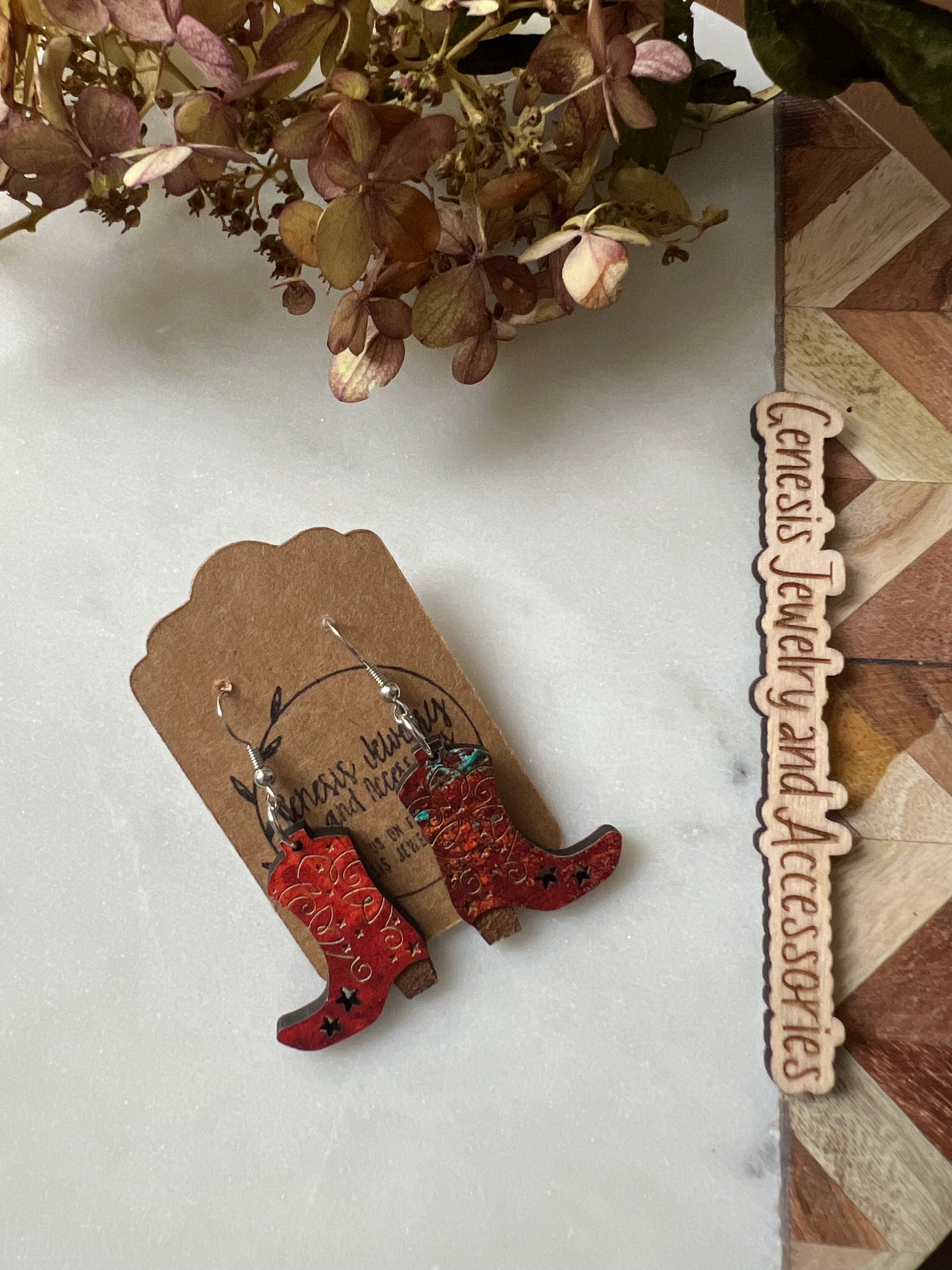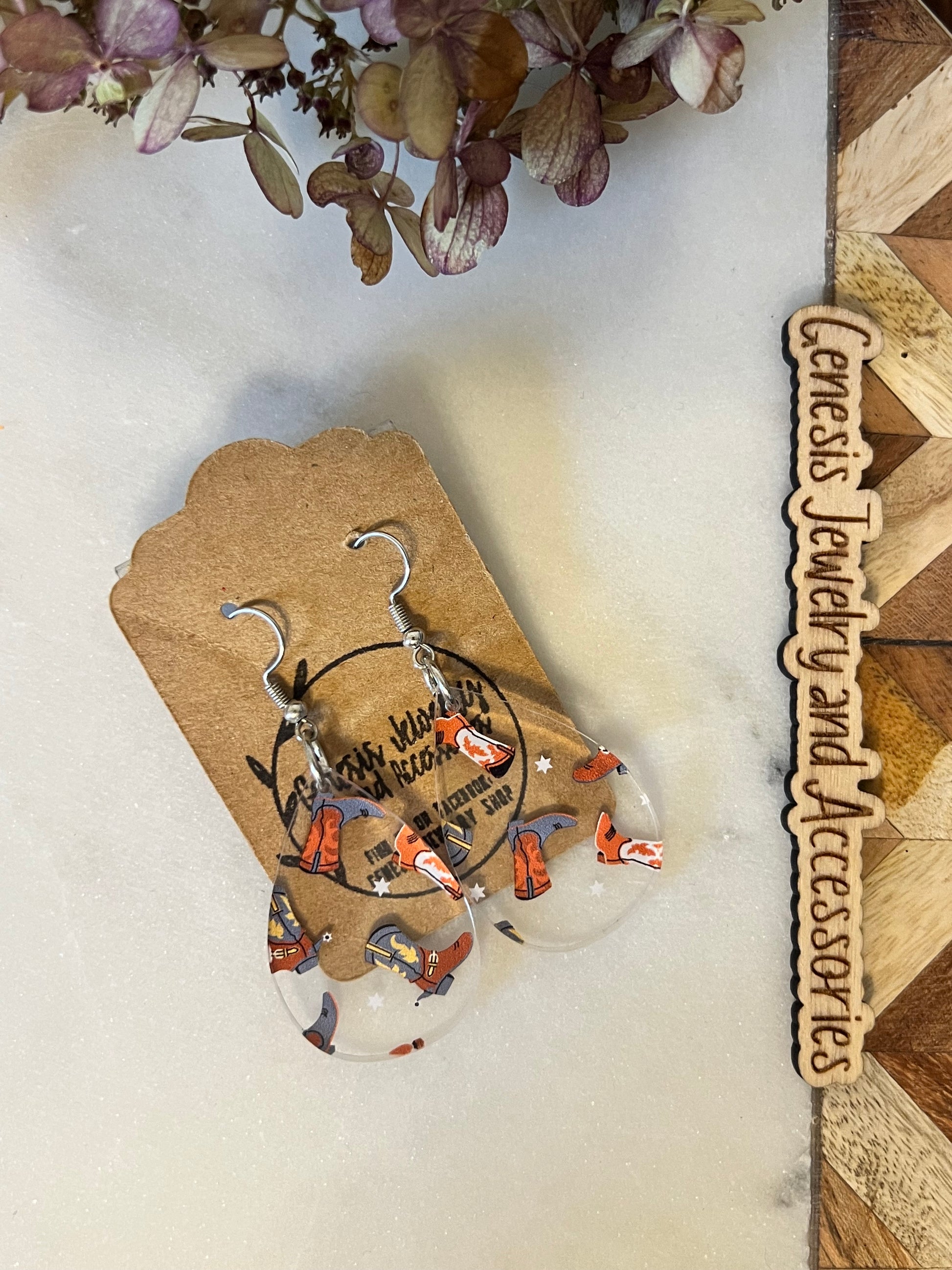 Custom western themed acrylic dangle earrings including cowgirl boots, hats and highland cows.